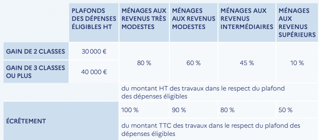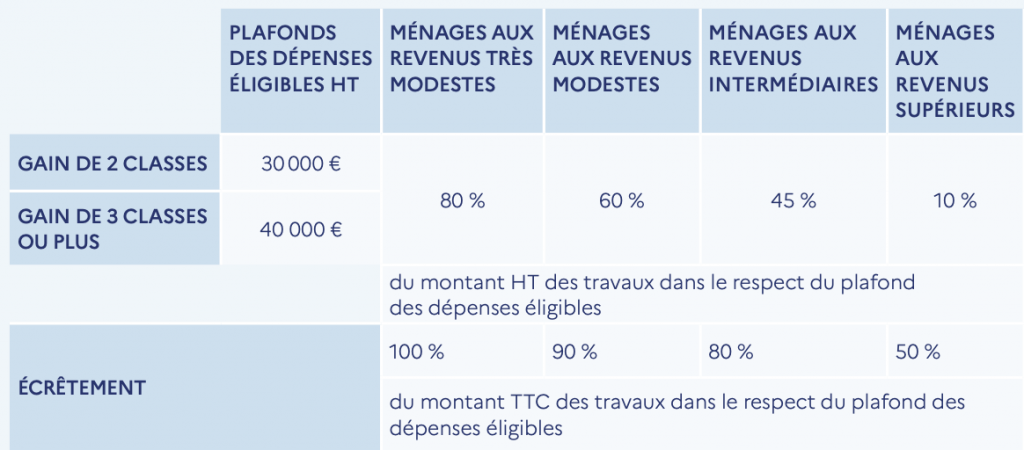 réaliser des travaux permettant un gain énergétique d’au moins 35 % (excepté en outre-mer) pour débloquer un premier palier de subvention, et un gain énergétique d’au moins 50 % pour débloquer le second palier ;