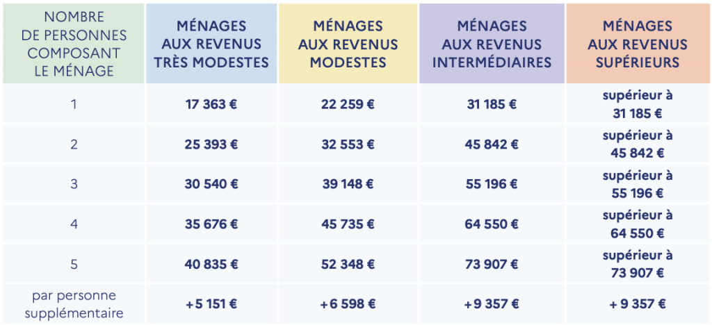 L’éligibilité est également soumise à des conditions de revenus, déterminées par le barème couleur (bleu, jaune, violet, rose) qui varie selon la composition du ménage et la zone géographique.